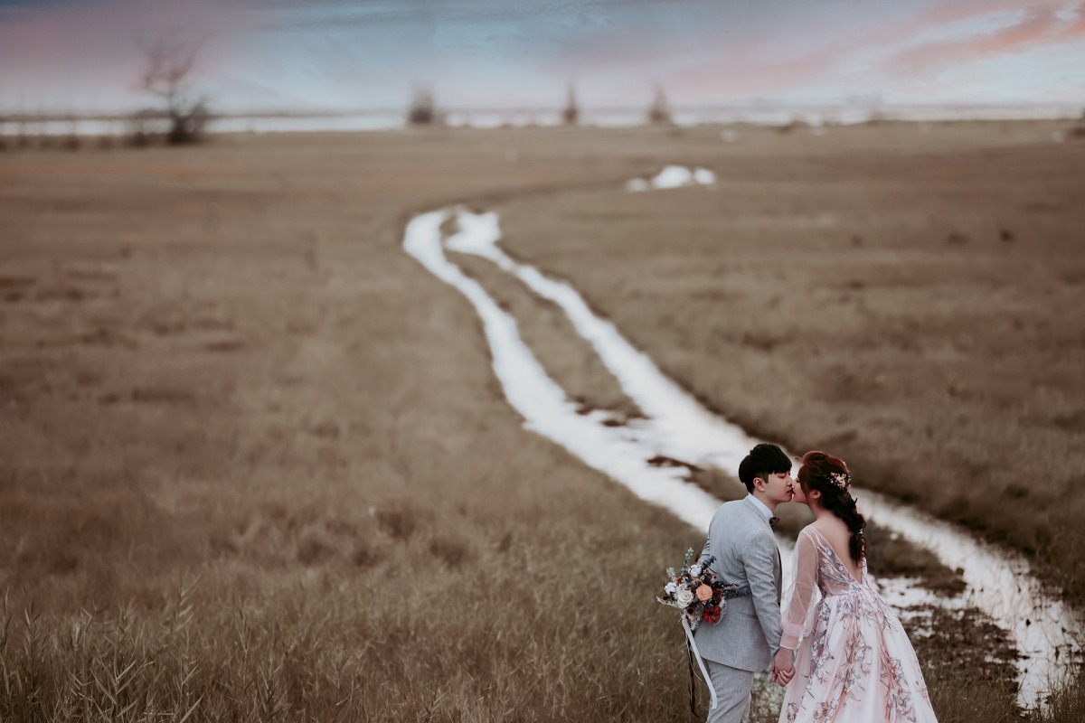 其實當天從早上7點一路弄到晚上9點才回到台中華納婚紗,最後一套在河堤拍的當時已經天暗到沒有燈根本看不到任何東西,但燈光師跟攝影師的配合竟然可以在黑夜中拍出夕陽落下的照片,宗瑋也是說來就來的燈光師完全不拖泥帶水怕拖延到新人的拍攝時間,而且為了新人也是毫無怨言犧牲奉獻第一個衝去幫忙探未知的路,很懂攝影師需要什麼,不會花太多時間在溝通上