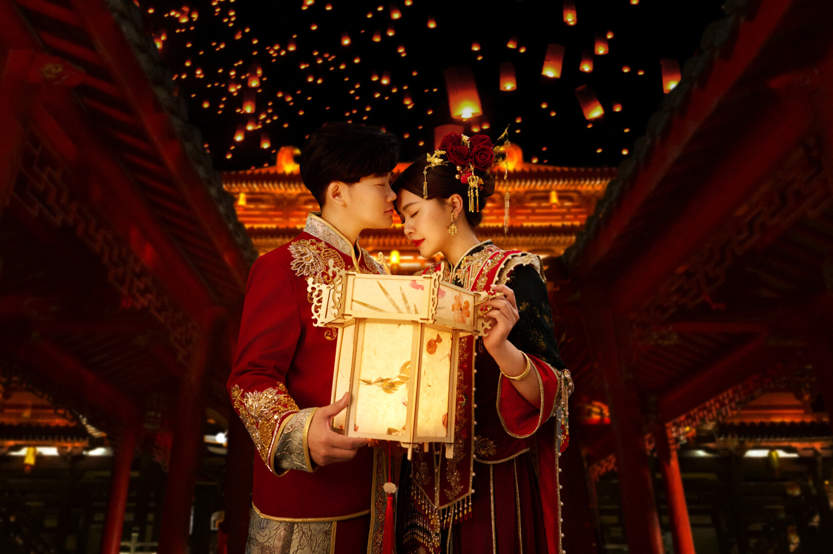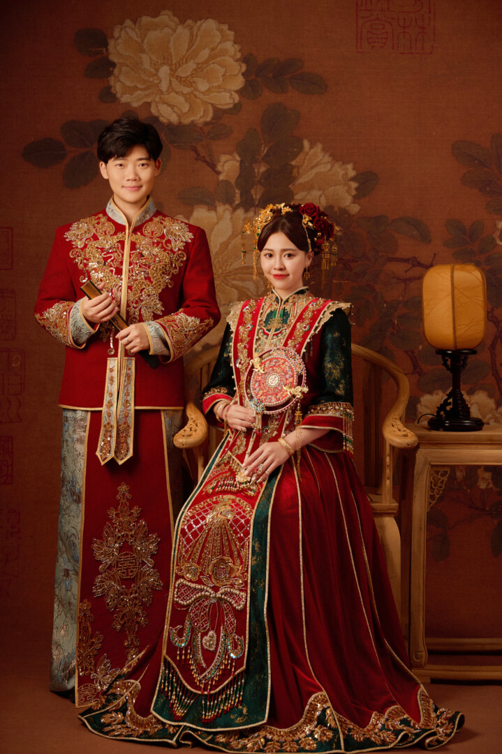 🏮中式古典的花好月圓 我超愛唐朝紅男綠女,感謝蘇菲老師的訂製秀服實現了我的夢想🪄 老婆的中式禮服是紅綠金三色交織,柔美又貴氣,手工流蘇和披肩設計更讓儀式感倍增 我的部分(感謝蘇菲老師)跳脫市面常見的素雅設計,紅色和淺藍跳色的緞面繡布,充滿了創新層次感,胸前和袖口的立體珠鑽+金線刺繡,也增添了榮華富貴 造型的頭飾也別有用心,不只有中式流蘇金飾,還加入鮮紅玫瑰作為髮飾點綴,營造出「花開富貴」的寓意
