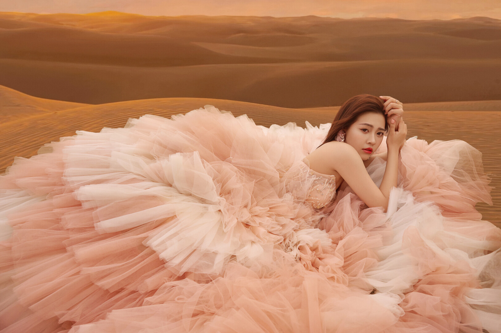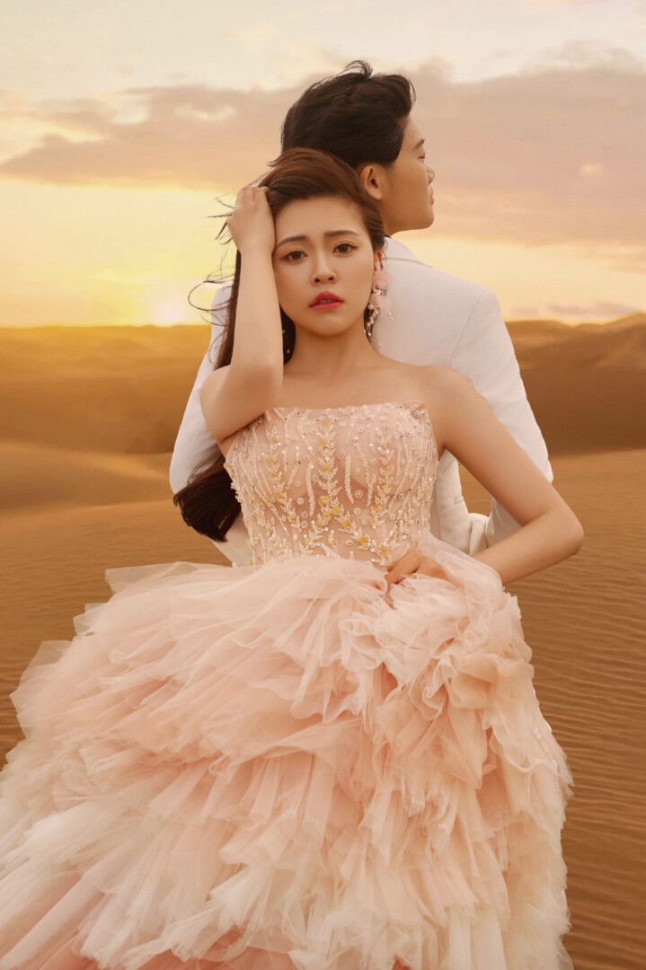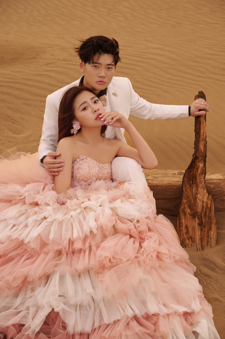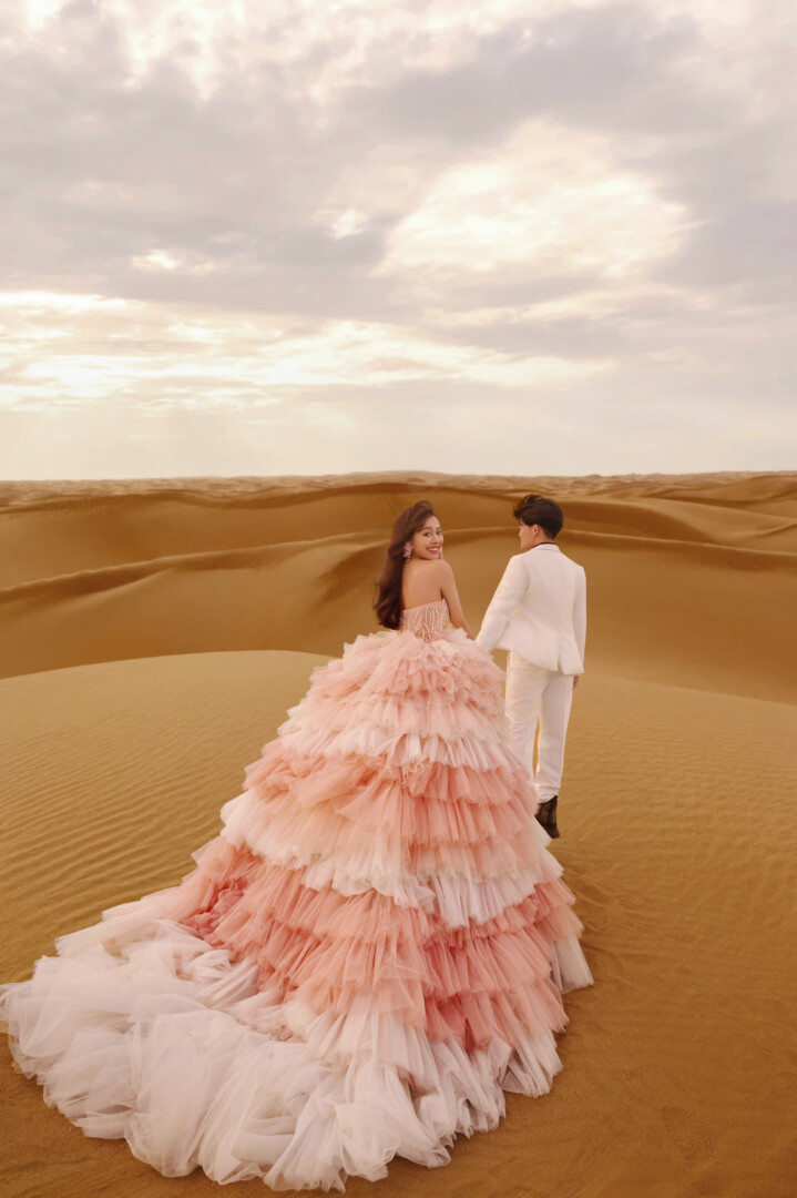 🏜️ 日落沙漠的浪漫系列 老婆的禮服是粉嫩漸層的多層次蓬裙,薄紗堆疊出雲層般的立體感,胸前的點綴低調閃耀不搶焦 造型上因為風超大很瘋🤪索性就自然放髮搭配微捲髮尾(我長捲髮控),營造隨性浪漫的旅拍氛圍